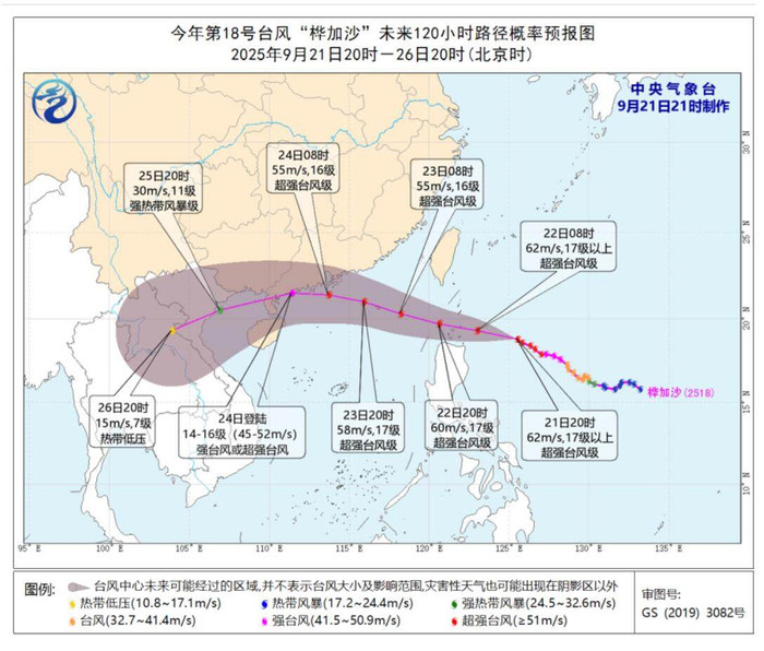 中央气象台预计,“桦加沙”将以每小时20公里左右的速度向西偏北方向移动,22日穿过巴士海峡后,将于23日凌晨进入南海东北部海面,并逐渐向广东中西部至海南岛东北部一带沿海靠近,强度有所减弱。预计21日20时至22日20时,巴士海峡、南海东北部海域、台湾海峡、东沙群岛、福建沿海、台湾岛东南部沿海将有7-8级、阵风9-10级大风,其中,巴士海峡、南海东北部偏东部分海域、台湾海峡有9-13级、阵风13-15级大风,台风中心经过的附近海域或地区风力可达14-16级、阵风17级及以上。台湾岛东部有大到暴雨,局地大暴雨(100-150毫米)。