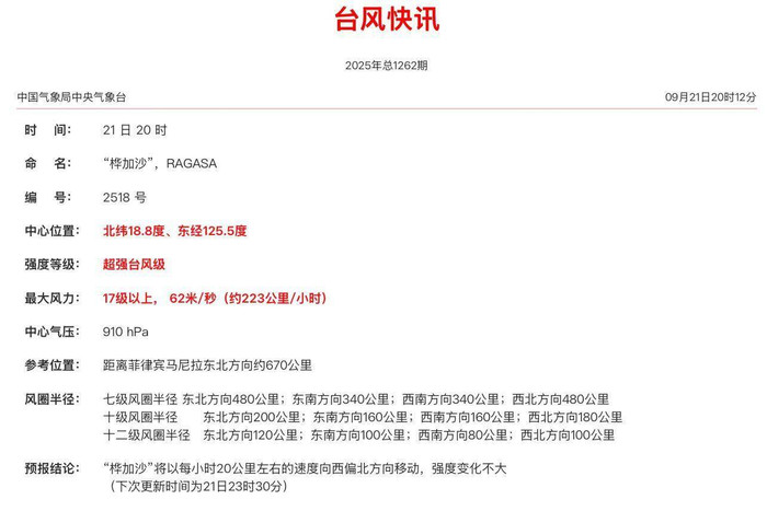 根据中央气象台9月21日20时12分发布的台风快讯,今年第18号台风“桦加沙”,中心附近最大风力达到62米/秒信富网,已经达到17级以上。