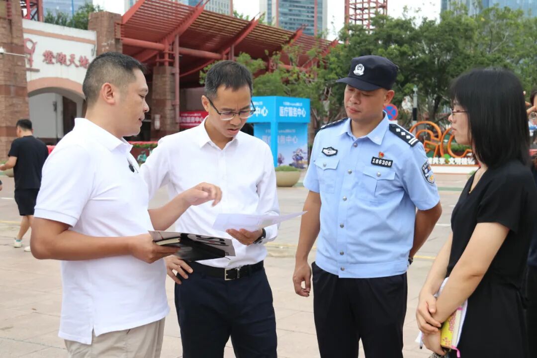 在千灯湖市民广场,检查组对假期即将举办的大型文旅活动——千灯湖cosplay潮玩节进行安全检查,详细了解活动舞台搭建情况、各玩乐区域分布等,督促相关负责人要严格落实消防安全、食品安全等各项工作。谢展明提出,由于活动人流量大、涉及美食摊位,还需要重点关注“火、气、电、安全通道”四方面,并做好应急预案。